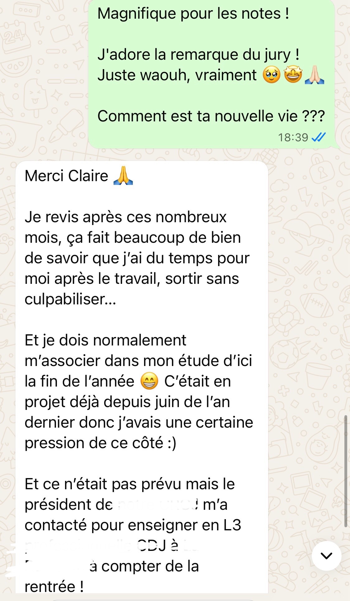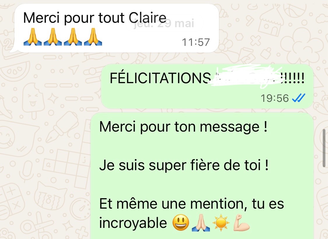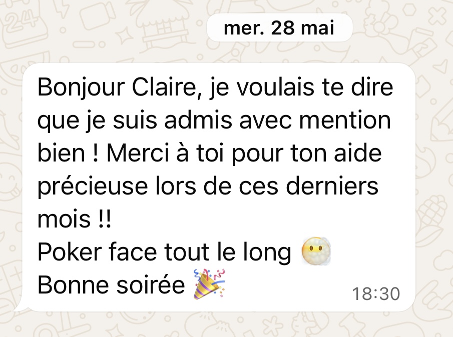 Le premier lot à remporter : une session individuelle d’une heure avec Claire, pour réussir l’examen d’aptitude ! A utiliser sous 12 mois. Remportée par Marine : félicitations !